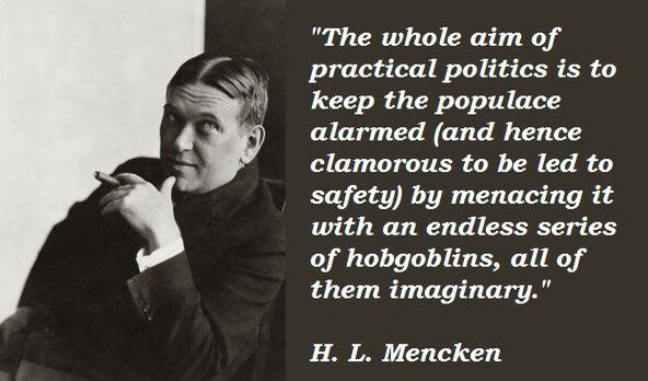 Henry Mencken was an American journalist, satirist and cultural critic, who lived from 1880 to 1956. He may have been from a different era, but I find some of his observations are still entirely relevant: